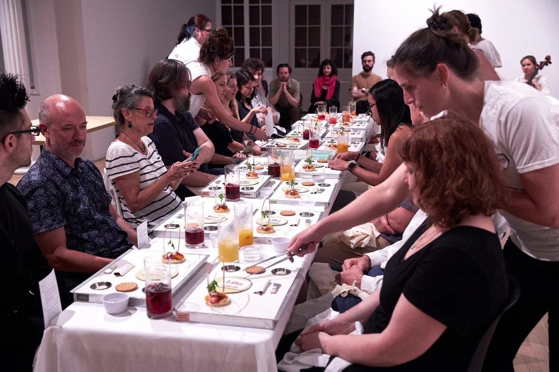 a 90 minute 9-dish progression in 3 acts by 10 Artists of the Institute performed by 7 servers and 1 musician for 32 diners with accompanying cookbook of 7-12 recipes, 3 essays, and assorted diagrams.